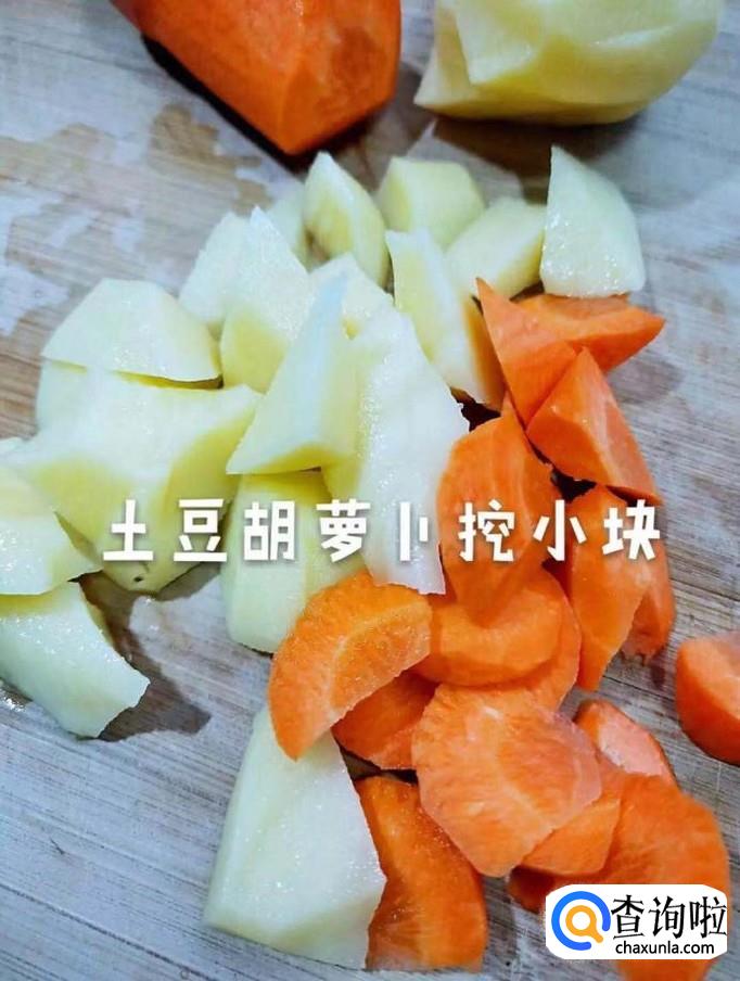 然后把土豆和胡萝卜用勺子挖成小块,如下图所示。
