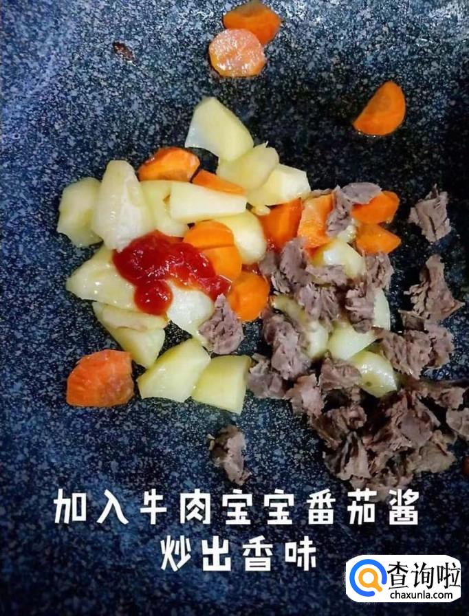 然后碗锅中加入适量的番茄酱(宝宝番茄酱),翻炒两分钟,如下图所示。