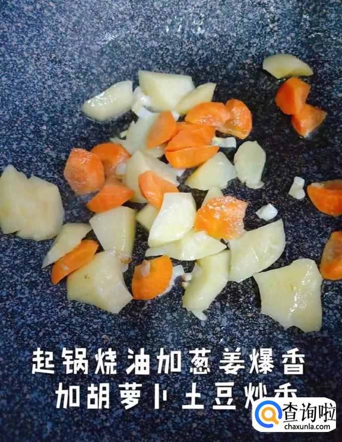 接着起锅烧油,加入葱姜爆香,倒入胡萝卜块和土豆块炒香,如下图所示。