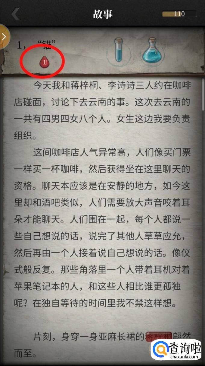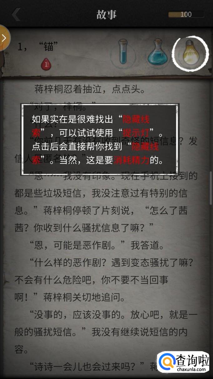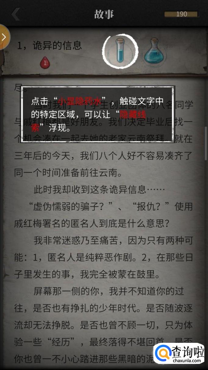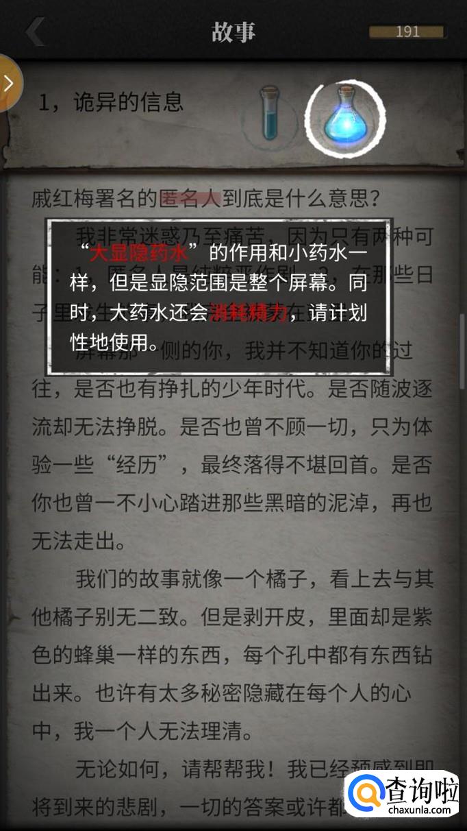 隐藏线索应该怎么找呢?如果你看到比较可以的线索可以用小显隐药水,如果这些字眼是线索的话,就会出现红色血珠,如果不是的话,玩家们可以继续寻找。使用小显隐药水是不消耗精力的哦。