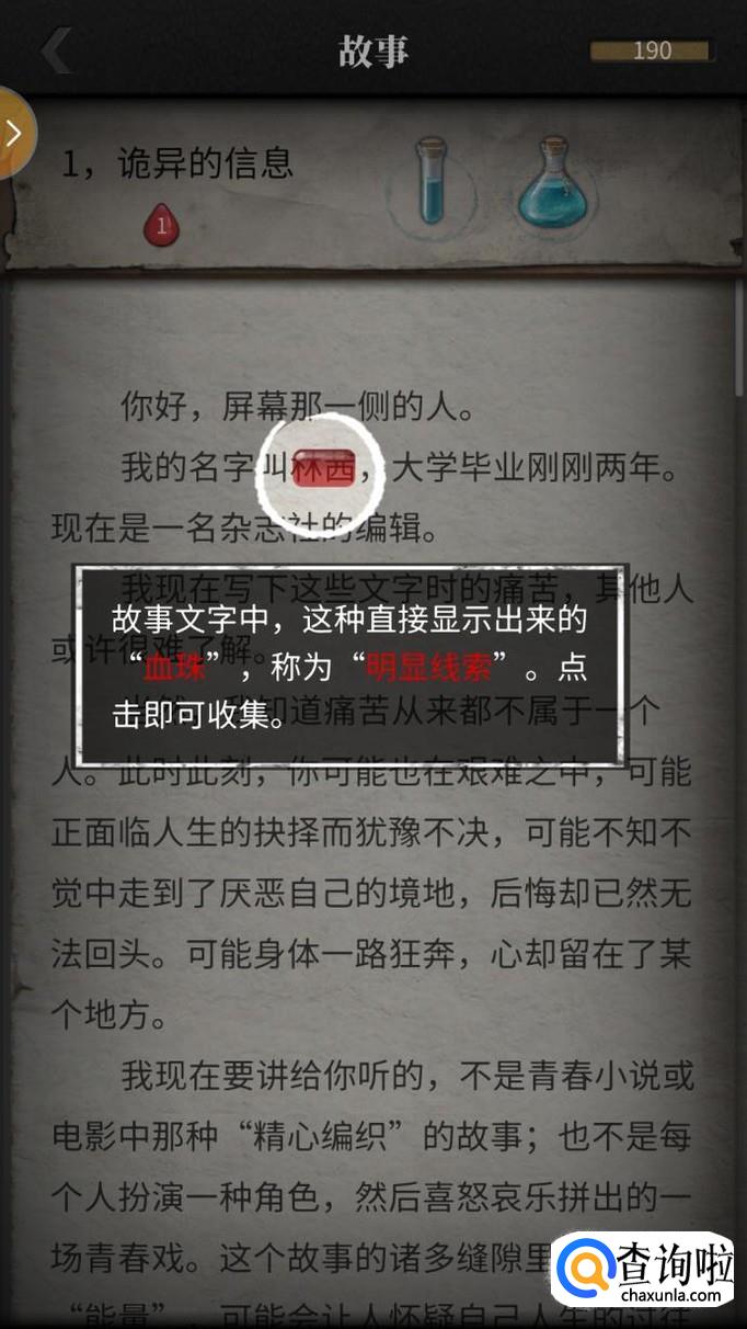 查看信息的时候,我们会发现有些字上面有一层红色膜,这些是血珠,是一些很关键的信息哦,也就是明显线索。点击收集起来,等到调查线索时可以用到的。