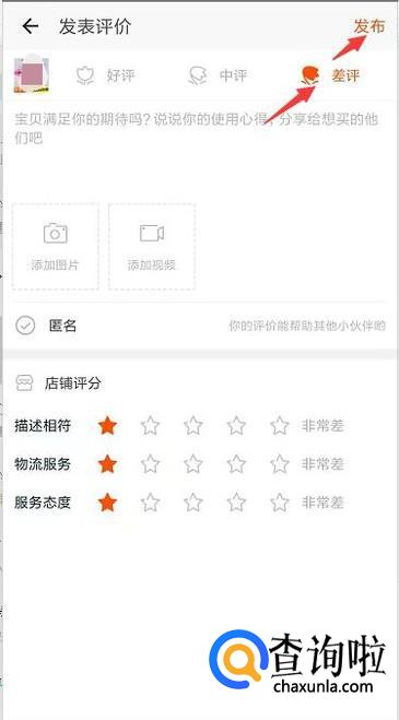 评价的时候我们可以点击右边的差评,然后写上对商品的评语再点击发布即可。