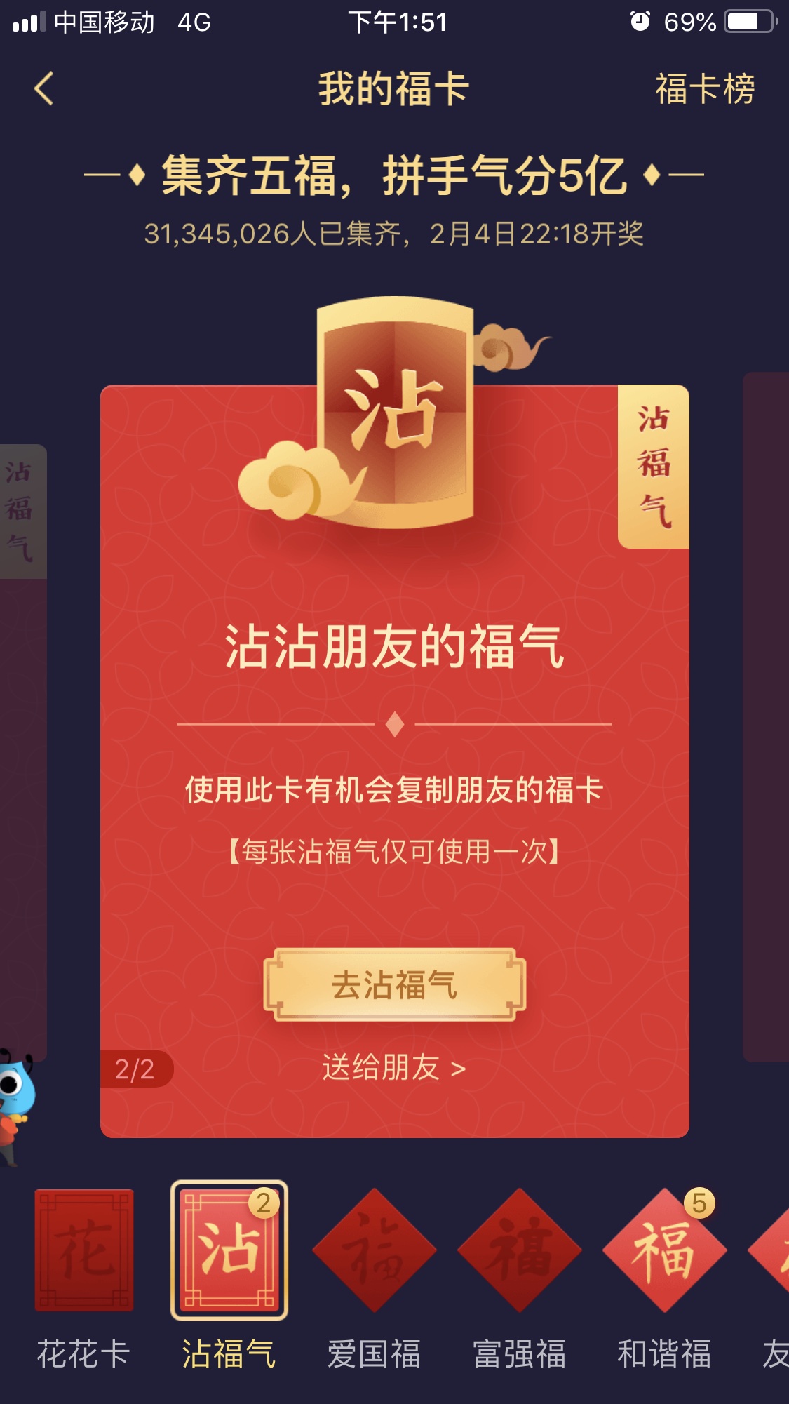 支付宝为了让更多用户集齐五福,官方上线了一个叫沾福气的小道具(扫福或到店支付宝消费时都有机会获取),使用沾福气,就可以随机复制一张好友的福卡。