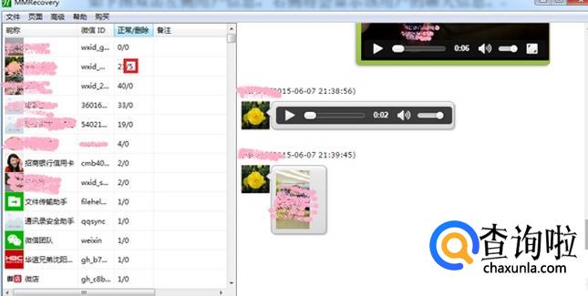 双击左侧微信用户,右侧将会显示当前用户的聊天信息,下图中红色方框中的“5”表示恢复出来的已被删除的聊天记录的数量。一般恢复的记录条数都特别多,该工具提供了智能记录过滤功能,可以过滤掉一些垃圾消息记录,只显示有价值的聊天记录。