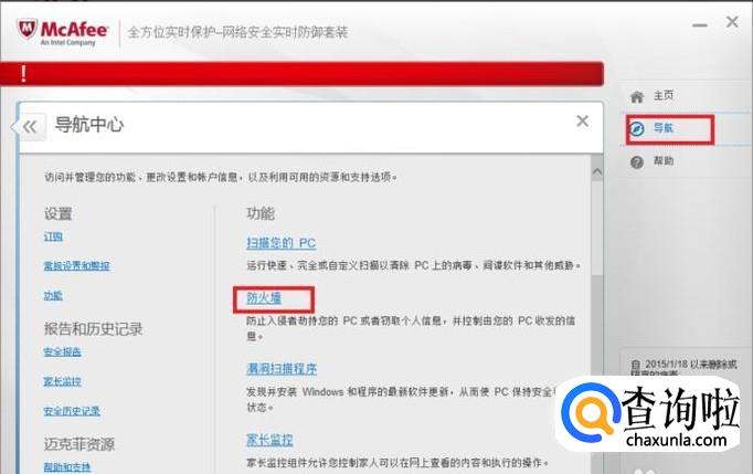 首先需要在电脑中打开迈克菲,找到导航,再找到导航中的防火墙;