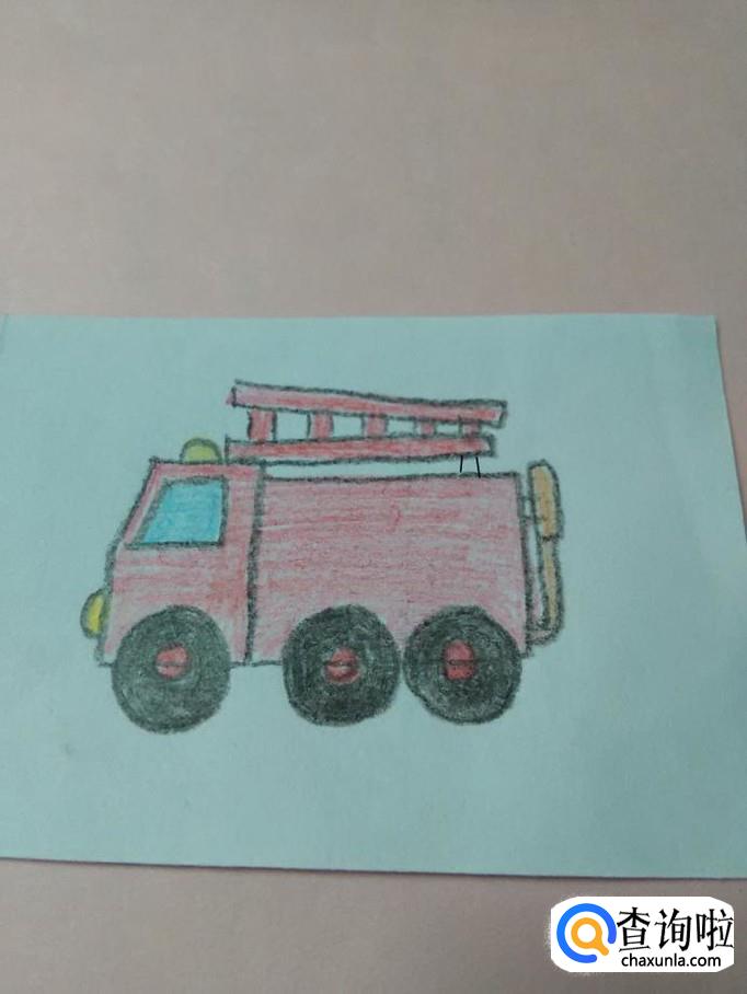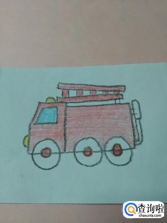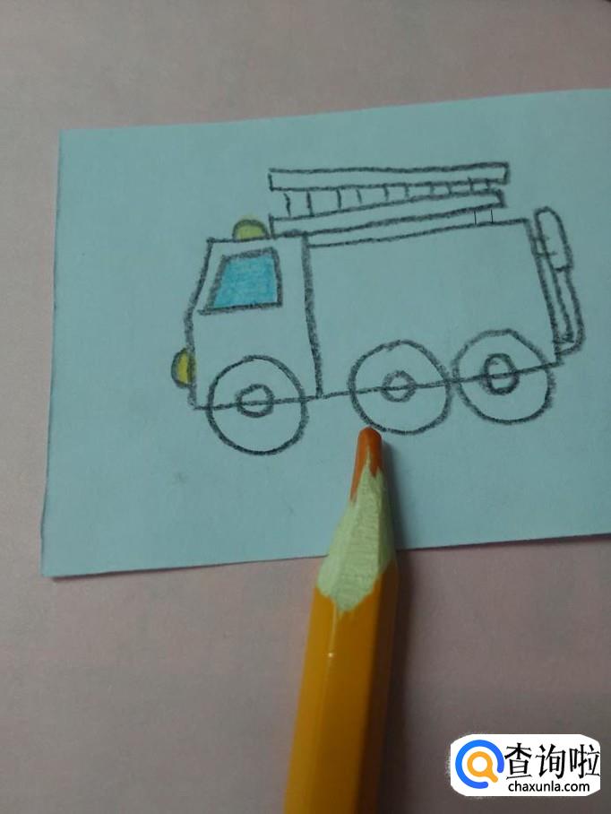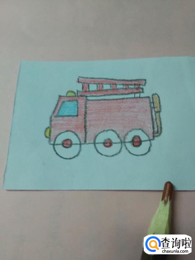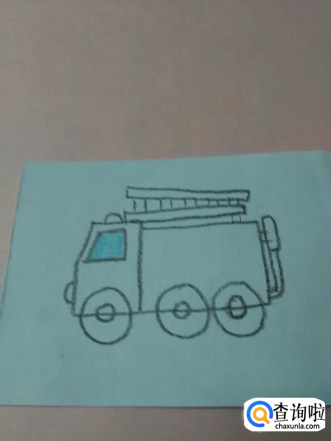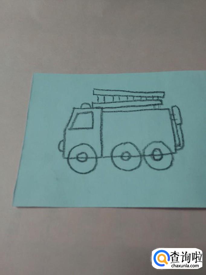 在车的上方,画四条横线,每两条在一起,表示梯子的侧杆,在侧杆之间,画几条竖线,表示梯子上面脚蹬的横杆。