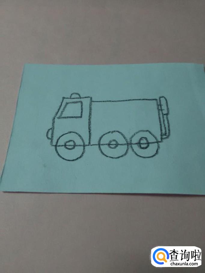在车身的右边,画两条横线,表示放水管的架子,在横线右侧,画一个长方形,表示水管的管头,在管头下面,画两条折线,组成水管。