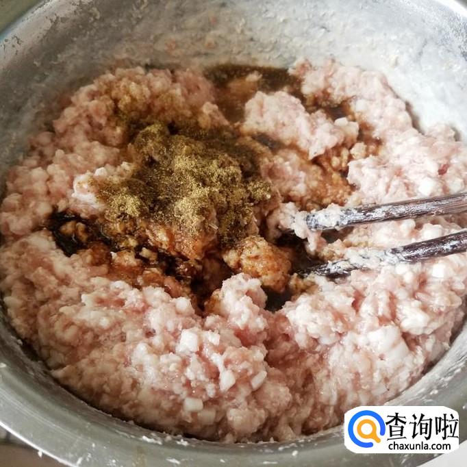 猪肉馅放入50克水顺着一个方向快速搅拌,使水融入到肉馅中,放入料酒,生抽,盐,调馅料,味素,葱,姜搅拌均匀,放入食用油搅拌均匀。