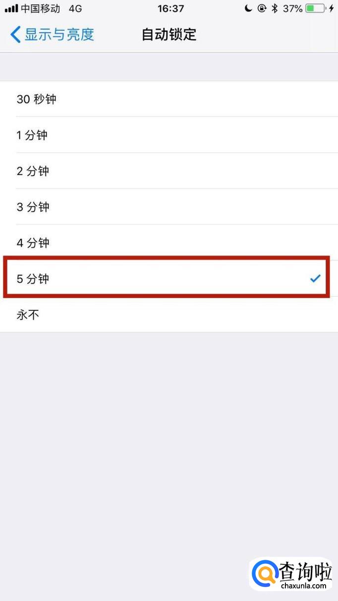 然后选择你想要的时间,如下图所示。这样设置完成,如果你的手机在规定的时间内没有任何操作,那么我们的屏幕就会自动锁定。