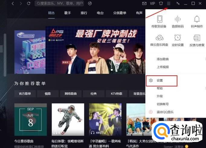 打开QQ音乐,点击右上角的三道杠图标,点击设置选项。