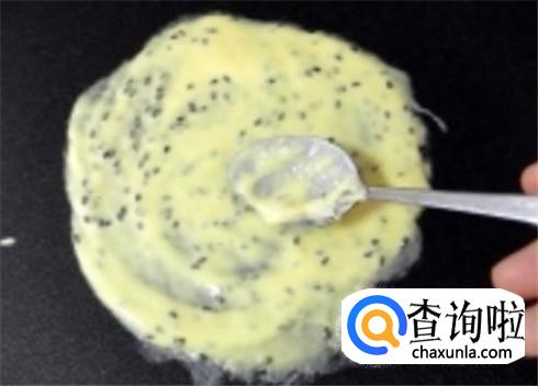 用细筛子筛一些面粉放进鸡蛋液里面,再次搅拌均匀,有熟黑芝麻的话撒一些进去。