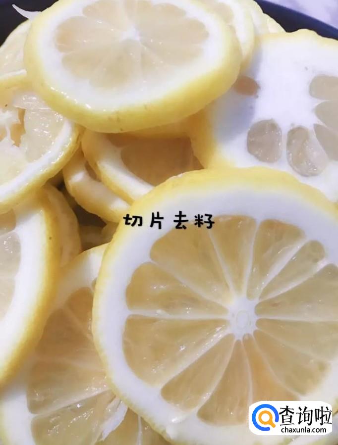 然后将洗干净的柠檬切成薄片,去籽,如下图所示。