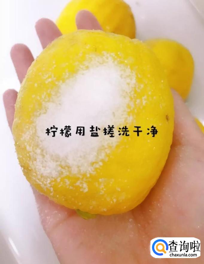 首先将柠檬用盐搓洗干净,如下图所示。