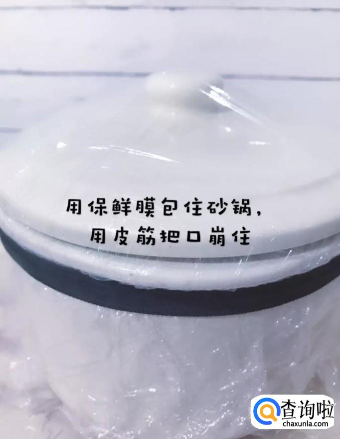 接着用保鲜膜包住砂锅,用皮筋把口绷住,如下图所示。