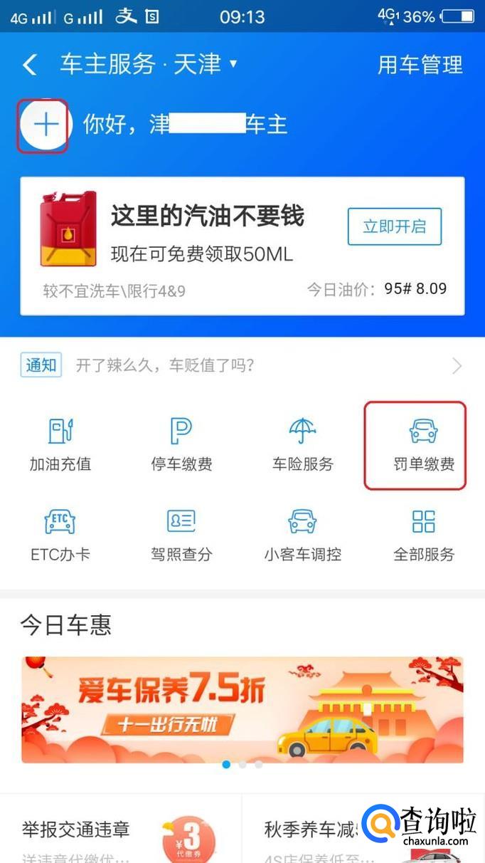 第一次使用,需要绑定一下自己的车牌等信息,点击上方标记的“+”就能添加汽车。绑定完成后,我们点击“罚单缴费”。