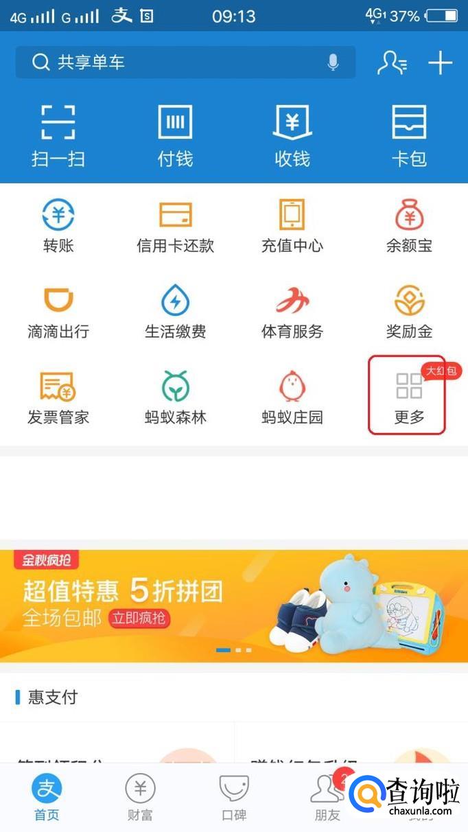 网上交违章罚款的方法有很多,比如交管12123app、一些银行的手机银行等。现在支付宝也有交违章罚款的功能了,下面我就来讲讲支付宝怎么交罚款。首先,打开支付宝首页,如图所示,点击“更多”。