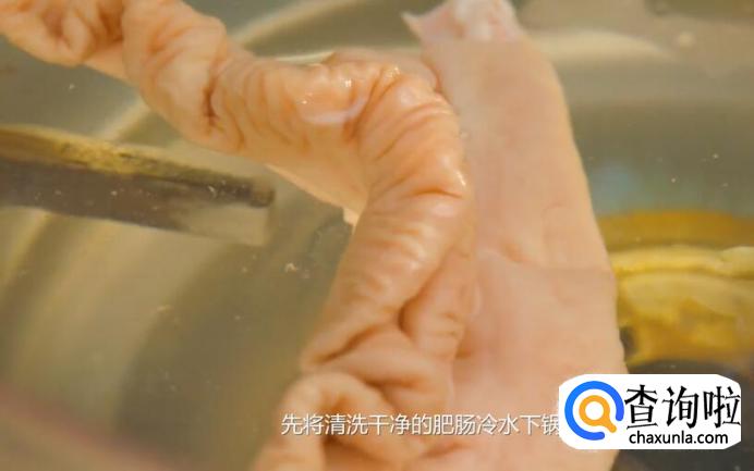 这个菜最麻烦的是在肥肠的清洗上, 在清洗肥肠的时候,可以是由外向内,慢慢推着把肥肠翻过来,然后再用面粉和白醋去搓,尽可能把肥肠内壁上面的油脂去掉。这样对于祛除它的异味,效果也会很显著。