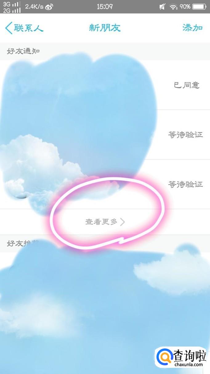 最后,大家就会看到自己发出好友申请的人或者对自己发出好友申请的人,我们惦记我“查看更多”便可以看到以前的好友申请