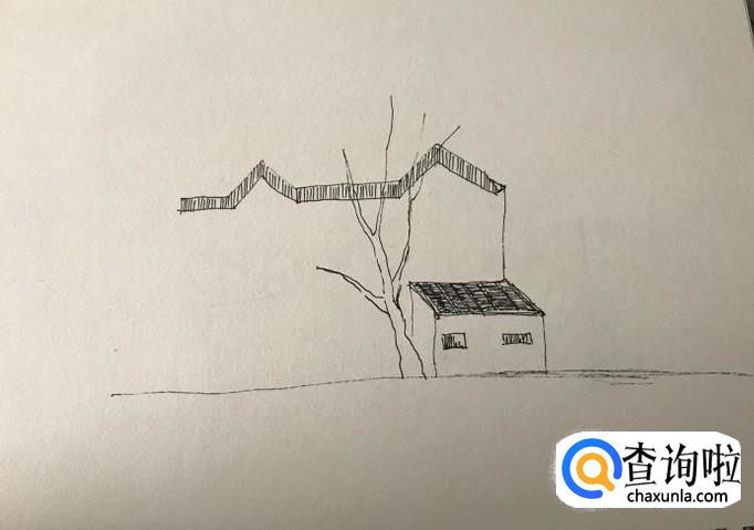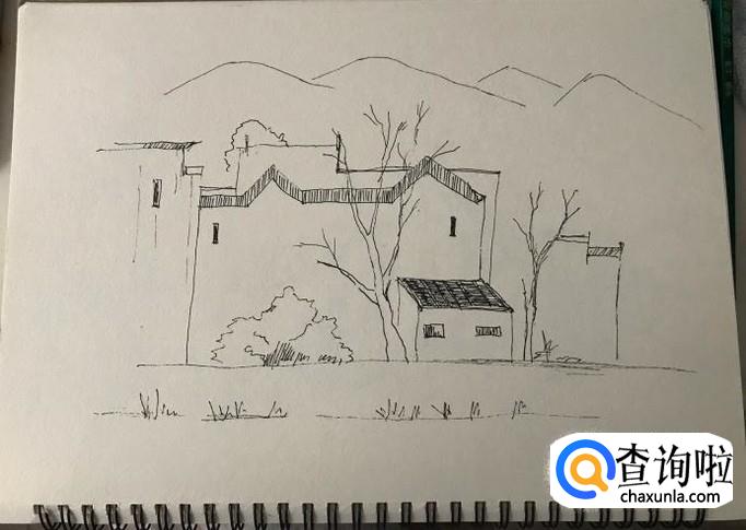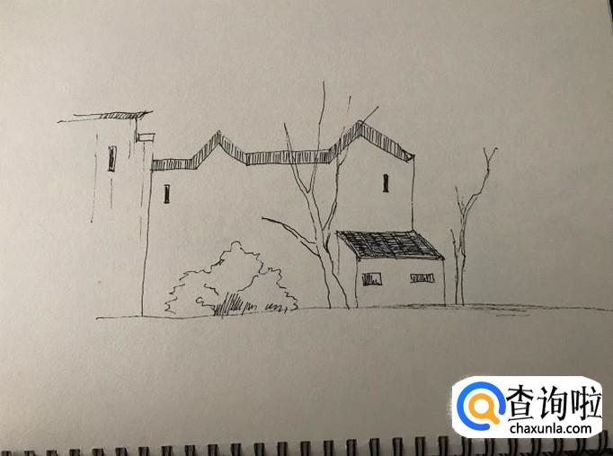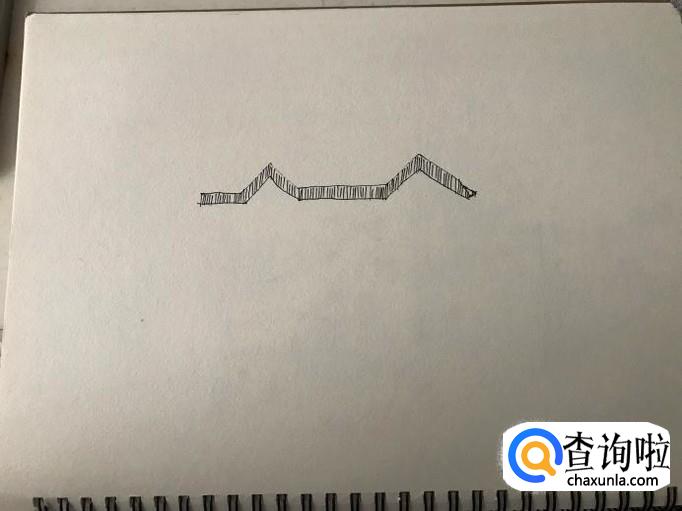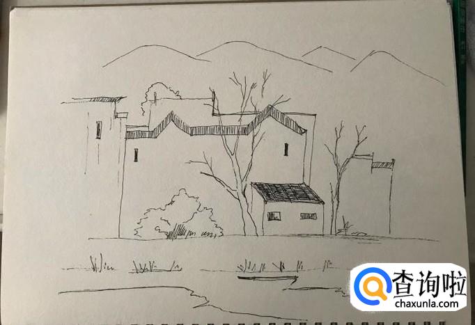 首先我们要绘制出徽派建筑的屋顶,这个也是构图的关键。一般这样的建筑立面上比较长,构图就要横向,同时基本将其居中。