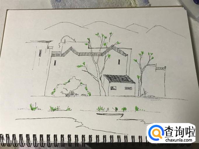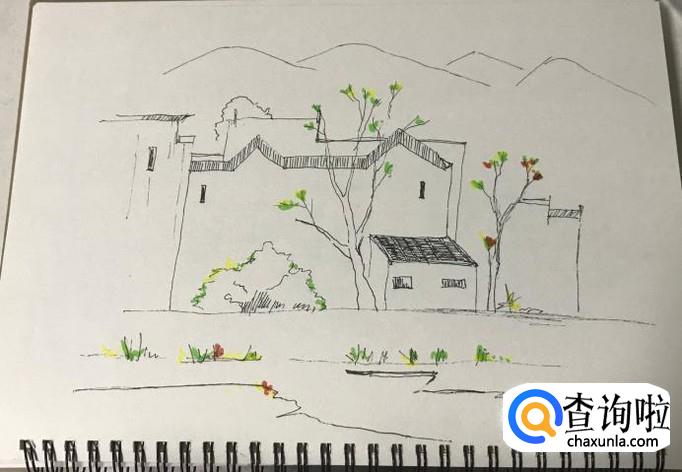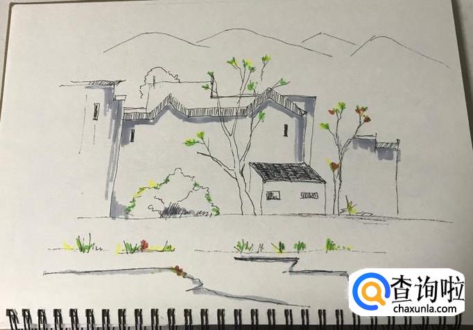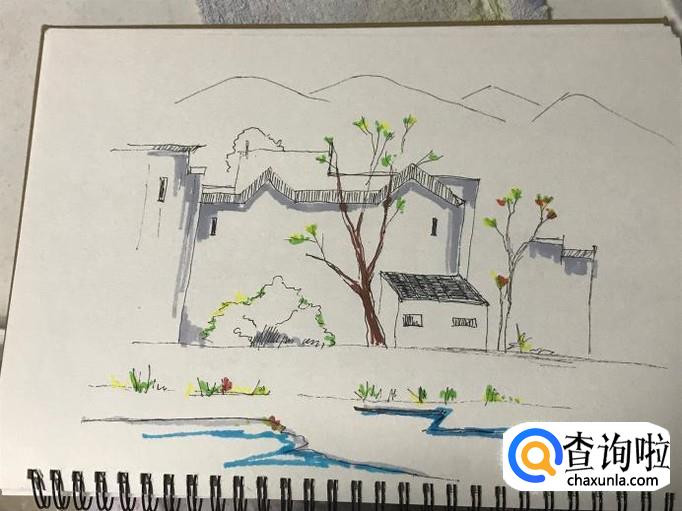 选择灰色的笔给建筑外立面加颜色。建筑的屋顶需要上深灰色。白墙部分在其边缘增加几条灰色就可以。小溪的暗部也可以在这个时候添加灰色。