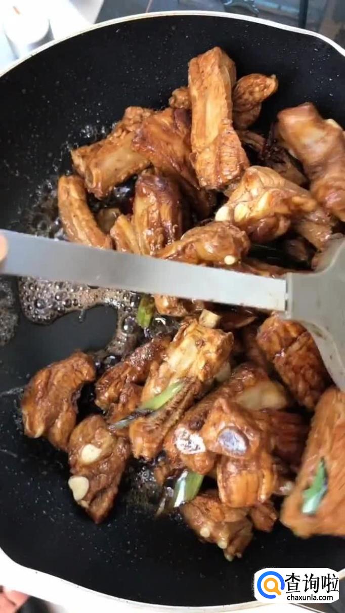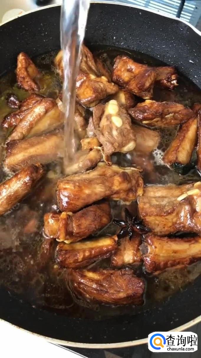 接着把处理好的排骨倒入锅中翻炒两分钟,然后往锅中加入适量的清水,如下图所示。