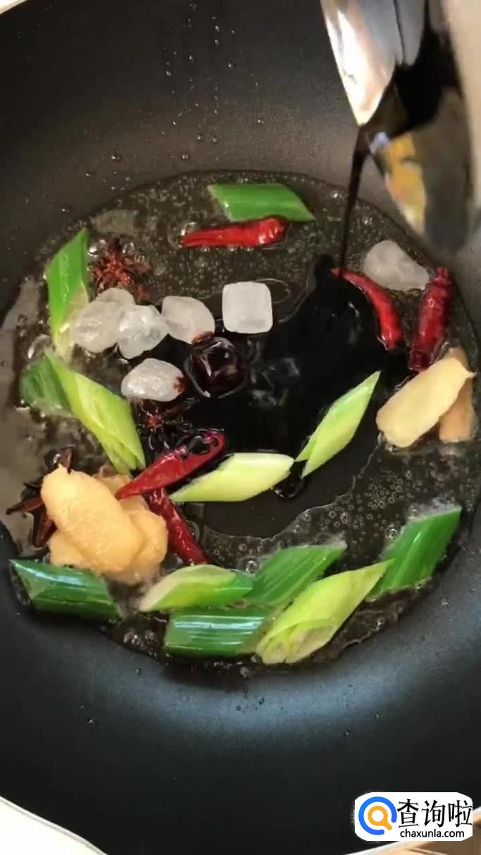 接着往锅中加入适量的生姜,干辣椒,大蒜和冰糖,翻炒到冰糖融化,如下图所示。