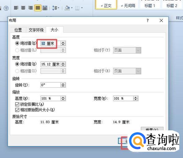 弹出的界面,我们将高度的绝对值改小一些,然后我们点击确定;