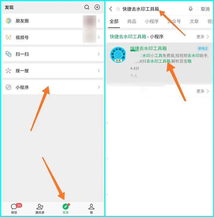 先打开抖音,找到你要下载的视频,点击分享图标,复制链接;接着打开微信小程序,搜索“快捷去水印工具箱”并打开,进入小程序后,把上面复制的链接,粘贴进去,然后开始解析-保存到手机,即可得到无水印的视频了。