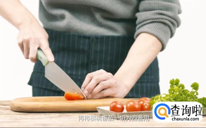 再将樱桃番茄一切为四备用。