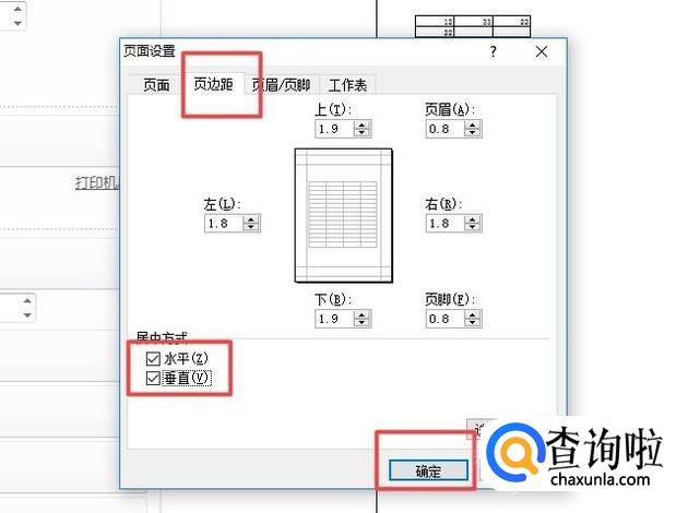 弹出的界面,我们点击页边距,之后我们将水平和垂直全部勾选上,然后点击确定就可以了,这样打印就居中了。