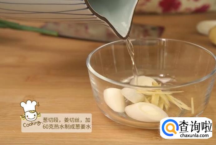葱切段,姜切丝,加60g热水制成葱姜水。
