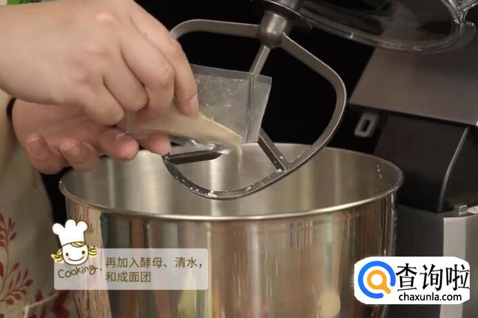 将中筋面粉倒入厨师机中,再加入酵母、清水,和成面团。