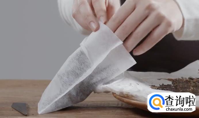 首先用茶刀将青砖茶分成小片,封入茶包中。