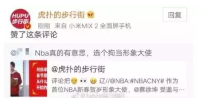 虎扑官方微博也坐不住了,点赞了某条质疑蔡徐坤的评论。