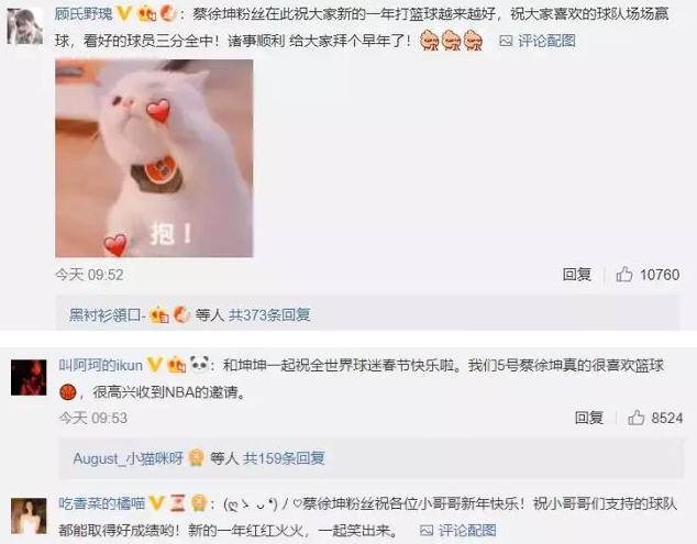 2019年1月18日NBA官方发出了新春贺岁片,当红小生蔡徐坤作为首位中国明星,和“字母哥”阿德托昆博、汤普森和利拉德一起成为了今年的新春贺岁形象大使。对此,蔡徐坤的粉丝们十分高兴,纷纷留言祝贺。而篮球迷们则认为让这样一个不会打篮球的流量明星来代言,是对NBA与篮球的极不尊重。