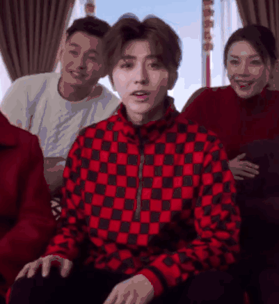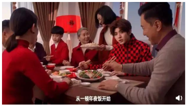 而蔡徐坤穿着喜庆的大红色棉衣,和家人一起坐着享用年夜饭、看电视。