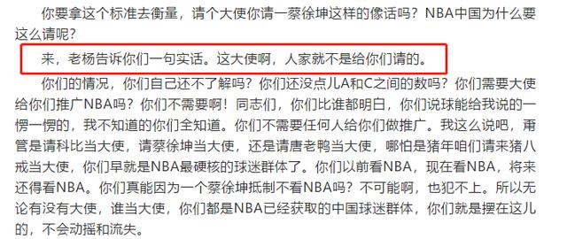 随着这件事情越闹越大,国内著名的评论员杨毅也出来表态了,直接说道:“老杨告诉你们一句实话。这大使啊,人家就不是给你们请的。”随后他还补充道:“你们需要大使给你们推广NBA吗?你们不需要啊!同志们,你们比谁都明白,所以无论有没有大使,谁当大使,你们都是NBA已经获取的中国球迷群体,你们就是摆在这儿的,不会动摇和流失。”