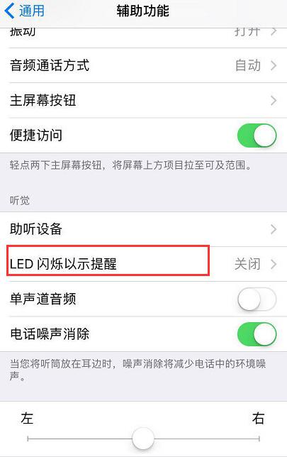 4、向下滑动,在听觉中找到LED闪烁以示提醒。