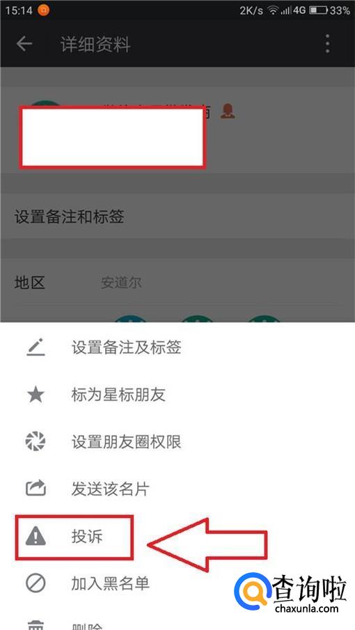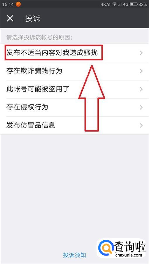 选择“投诉”选项,然后根据自己的需求选择投诉原因,这里以“发布不适当内容对我造成骚扰”为例。