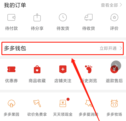 用户只需要登录拼多多官方APP之后,点击右下角的“个人中心”,页面跳转之后就可以在“我的订单”下方找到多多钱包。多多钱包是拼多多官方推出的一项支付服务,用户只需要完成实名认证字后,绑定银行卡就可以开通“多多钱包”。