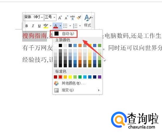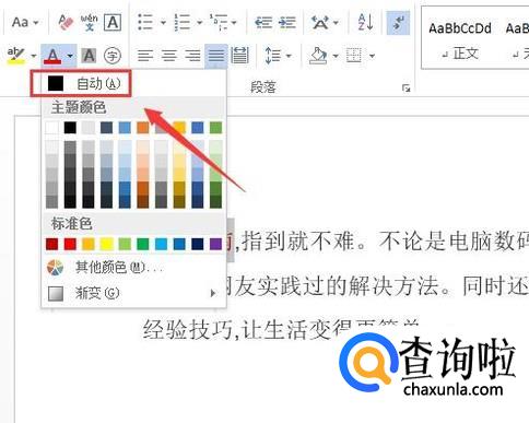点击字体颜色的下拉箭头,在其下拉列表里找到自动选项,如图所示: