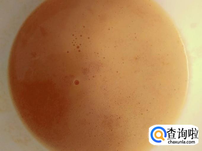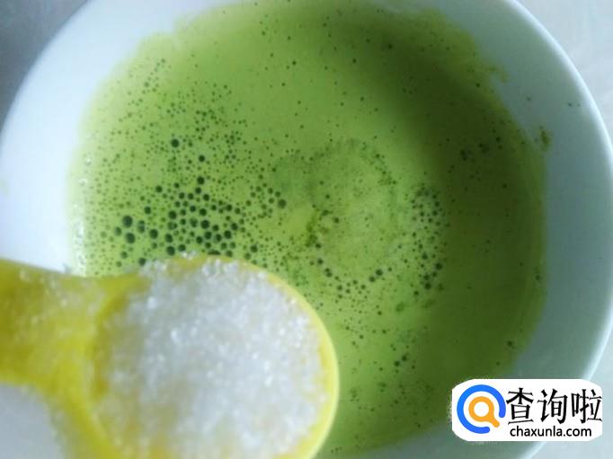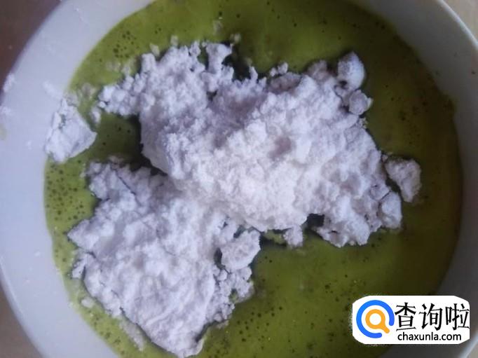 然后倒出来过滤,再把菜汁倒到碗里,加适量的白糖,40克的木薯淀粉搅拌均匀备用。