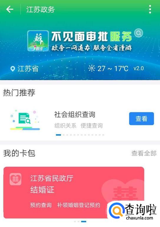 进入“江苏政务服务”,下方有一个江苏民政局的结婚证选项,点击进入“江苏政务服务”。