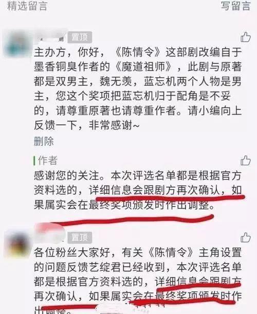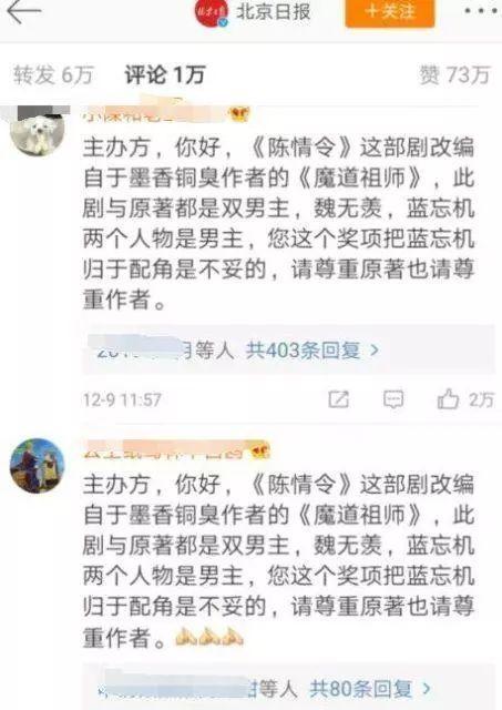 为了表示抗议,这些粉丝在北京日报微博下控评,一齐刷“您这个奖项把蓝忘机归于配角是不妥的,请尊重原著也请尊重作者”。