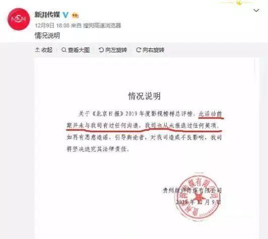 随后,新湃传媒就发出声明,声称北京日报2019年度影视榜样总评榜在“此活动前期并未与我司有过任何沟通,我司也从未报选过任何奖项”。