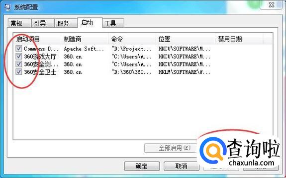 然后切换到启动选项卡,把不需要自动启动的选项取消勾选,如下图所示: