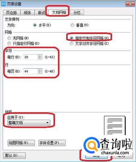 网格中点击选中“指定行和字符网格”,就可以对每页行数和每行字数进行设置了,设置完点击“确定”。