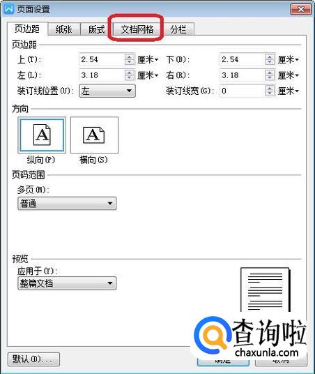 调出“页面设置”选项框,点击上面的“文档网格”标签。