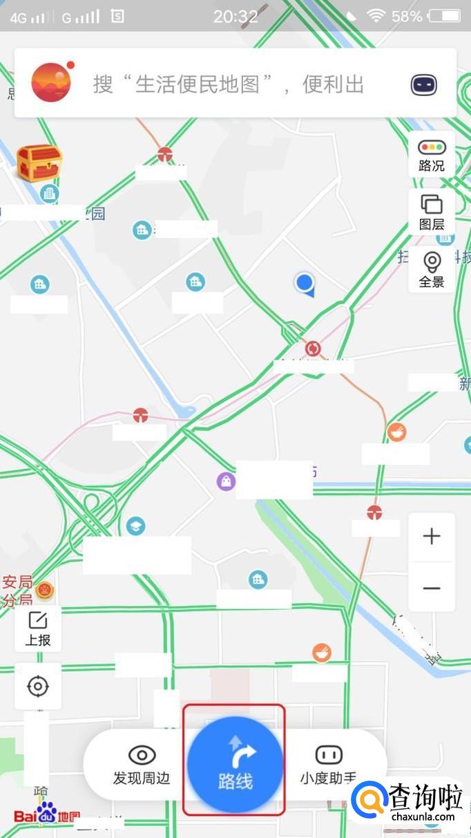 首先,我们打开百度地图app,见到这样的界面。我们点击图中的下方的“路线”按钮。