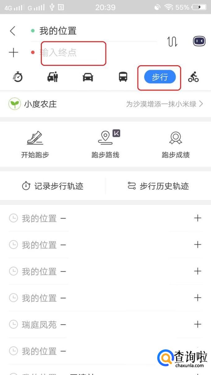 一般是步行的情况下,我们才采用AR实景导航,所以我们在图中输入终点名称后,点击图中的步行图标。